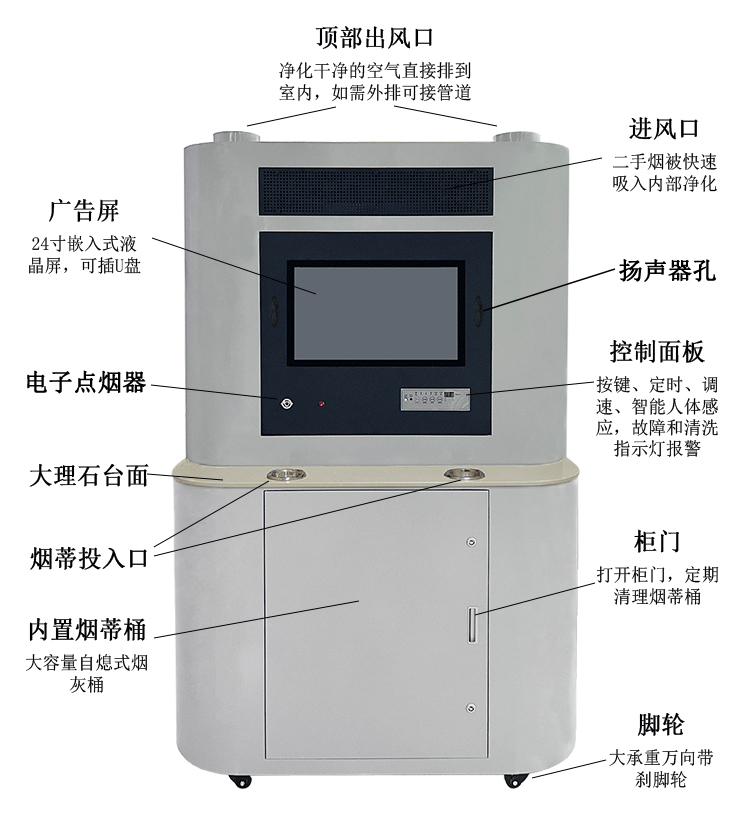 申瑞吸煙室空氣凈化機(jī),內(nèi)置高壓靜電場(chǎng)(電子集塵室)+層流過(guò)濾網(wǎng)+活性炭吸附+負(fù)氧離子功能,高效凈化清新室內(nèi)空氣。