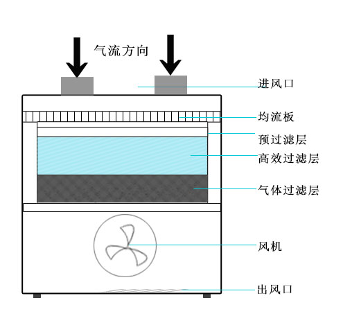 2.主過(guò)濾層過(guò)濾梯度設(shè)置:初中效過(guò)濾+HEPA高效過(guò)濾。凈化顆粒直