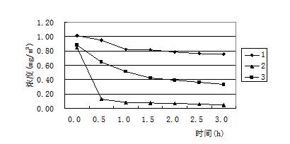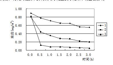 圖2 比較(圖2)中的三條凈化效率曲線可以看出,在相同的測試條件下,使用相同的技術(shù),但是凈化效率卻有很大差異,2號產(chǎn)品能使甲醛濃度迅速下降,1h內(nèi)即達(dá)到0.1mg/m3以下,可是1號產(chǎn)品在開啟3h后,甲醛濃度依舊在0.7mg/m3以上。許多研究表明,光催化可以在常溫常壓下即可將空氣中的有害氣體分解成無毒物質(zhì)[7],而且沒有二次污染,是一種有效的去除各種室內(nèi)污染物的先進(jìn)技術(shù),但在我們測試的同時檢測環(huán)境艙內(nèi)的臭氧濃度,發(fā)現(xiàn)臭氧濃度在光催化技術(shù)的凈化器凈化過程中均有不同程度的升高。這說明在考慮選擇光催化凈化產(chǎn)品的同時,不應(yīng)該忽視其副產(chǎn)物臭氧的存在。另外光催化產(chǎn)品還存在催化劑失活的現(xiàn)象。催化失活是指催化劑表面被反應(yīng)產(chǎn)物或顆粒物覆蓋,失去催化效果,必須及時更換核心部件。因此如何選擇副產(chǎn)物的生成量較小,并且壽命較長的催化產(chǎn)品是催化劑類凈化器選型的關(guān)鍵。同一臺凈化機(jī)改進(jìn)前后凈化效率的比較 由于同種技術(shù)的凈化效果會因?yàn)樵O(shè)計(jì)工藝或者制造技術(shù)的不同形成較大差異,所以很多凈化器廠家也在不停的改進(jìn)生產(chǎn),希望可以得到效果好、副產(chǎn)物少、壽命長的產(chǎn)品。圖3中表示的是一家使用復(fù)合式技術(shù)廠家生產(chǎn)的凈化產(chǎn)品,主要采用的技術(shù)有過濾、吸附、高壓靜電和負(fù)離子,(圖1、2、3)中曲線分別是同一臺凈化器未經(jīng)過改進(jìn)和兩次改進(jìn)后得到的凈化效率曲線,三次試驗(yàn)時凈化器內(nèi)部結(jié)構(gòu)基本相同,只是在關(guān)鍵技術(shù)處做出調(diào)整,測試時得出的凈化效率有明顯差異。從圖中可以清晰的看出,三條凈化效率曲線明顯由低到高,說明關(guān)鍵技術(shù)的調(diào)試對凈化器的凈化效率有顯著影響。