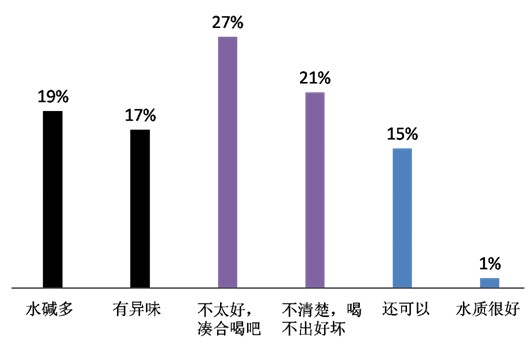 - 飲水安全,與每一個人的健康息息相關環保部不久前發布的《2013中國環境狀況公報》顯示,我國水污染狀況令人憂慮:對長江、黃河、珠江等十大水系的斷面監測顯示,黃河、松花江、淮河和遼河水質輕度污染,海河為中度污染,而27.8%的湖泊(水庫)呈富營養狀態。生活中,百姓切身感受到的飲水安全問題如何?2014年6月至8月,半月談社情民意調查中心開展了“水杯里的民生:講講您身邊的生活用水”網絡調查,圍繞水污染程度、污染源、百姓環境權與認知,對政府的期盼等問題,與網友進行交流,收集有效樣本1315個。被訪者中,36%居住在城市,32%在縣城,21%來自鄉鎮,11%在農村。六成被訪者憂飲水不安全,飲水消費正成為居家“開門第八件事”——污染程度:六成被訪者對所住地區自來水的水質表示不滿,其中多數人的感受是“不太好,湊合喝吧”(27%),明顯感覺到“有異味”的有17%,感覺“水堿多”的為19%。對水質表示滿意的人很少,占全體被訪者的16%,其中15%覺得“水質還可以”,只有1%覺得“水質很好”。