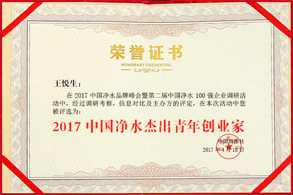 4月18日,2017中國凈水品牌峰會暨第二屆中國凈水100強(qiáng)企業(yè)頒獎盛典在北京維景國際大酒店圓滿落幕。榮事達(dá)水工業(yè)公司總經(jīng)理王悅生榮獲“2017年中國凈水杰出青年創(chuàng)業(yè)家”稱號。