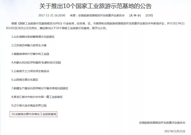 - 11月21日,全國旅游資源規(guī)劃開發(fā)質(zhì)量評定委員會發(fā)布公告,公布10個國家工業(yè)旅游示范基地,安徽省合肥市榮事達工業(yè)旅游基地成為安徽省唯一入選單位。