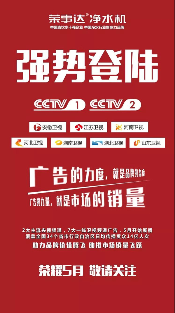 記者了解到,5月下旬,榮事達(dá)凈水機(jī)2018廣告新片將率先登陸CCTV1、CCTV2兩大央視平臺(tái),屆時(shí)將向全國(guó)觀眾呈現(xiàn)榮事達(dá)獨(dú)特的精神理念與品牌形象。