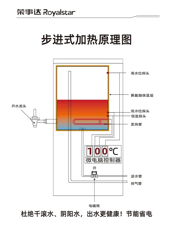 設備采用了RO反滲透、紫外線殺菌、多級凈化等先進工藝,有效去除了水中的泥沙、鐵銹、重金屬、余氯等有害物質,確保水質干凈、安全。同時,步進式加熱設計避免了“陰陽水”的產生,保證了連續供應開水的品質。